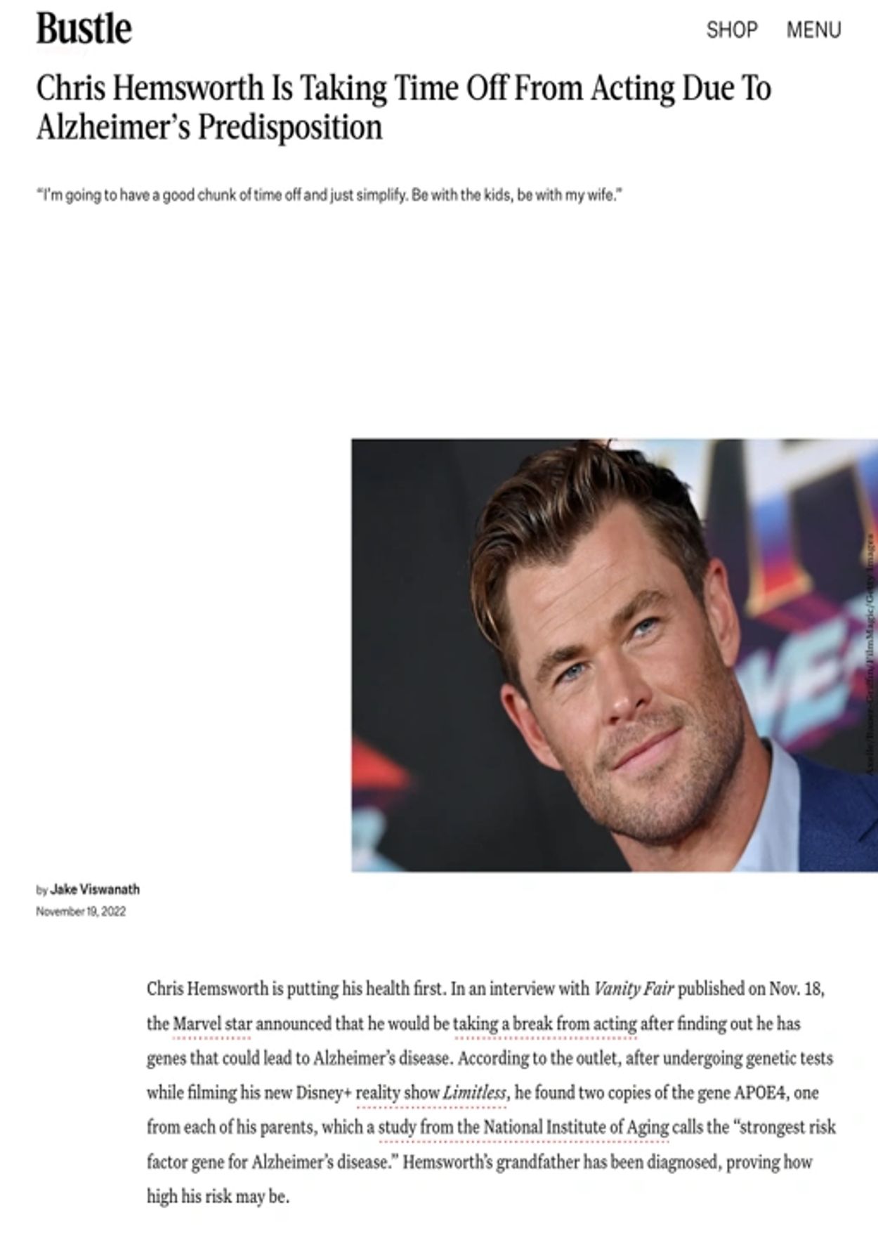 "Chris Hemsworth is taking time off from acting due to Alzheimer's Predisposition"